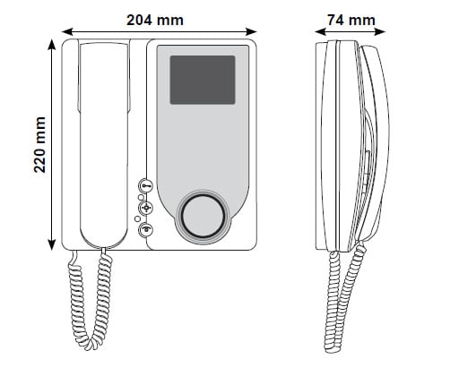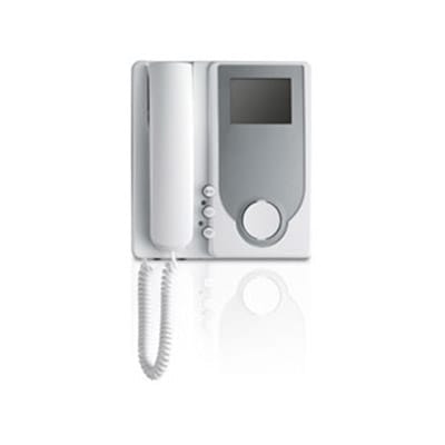 Videocitofono da parete per Sound System con schermo a colori 3,5 in, collegamento con cavo coassiale, staffa di fissaggio con morsettiera, altoparlante per le chiamate elettroniche e tre pulsanti (apriporta, autoaccensione e luce scale), regolazione delvolume di chiamata per 3 livelli ed esclusione della chiamata con indicazione su LED rosso, LED verde per indicazione di porta aperta, bianco
