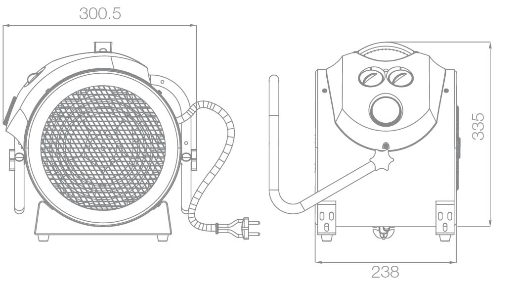 Struttura cilindrica in acciaio chiuso alle estremità con griglia di aspirazione e mandata.• Gruppo motoventilante con motore a poli schermati ad una velocità. Ventola in alluminio a 5 pale, direttamente calettata sull'albero motore.• Pannello dei comandi, posizionato sopra l'involucro cilindrico principale, in ABS, autoestinguenza V0, verniciato con integrata la maniglia per la movimentazione del prodotto.• Timer meccanico max 180 minuti che ne consente lo spegnimento ritardato.• Grado di protezione IPX4• Dispositivi d'appoggio in lamiera verniciata e piegata, con supporti antivibrazioni.• Cavo di alimentazione completo di spina di sicurezza a quattro poli del tipo industriale per i modelli trifase e con spina schuko per il modello monofase, lunghezza totale nominale del cavo 1800 mm.