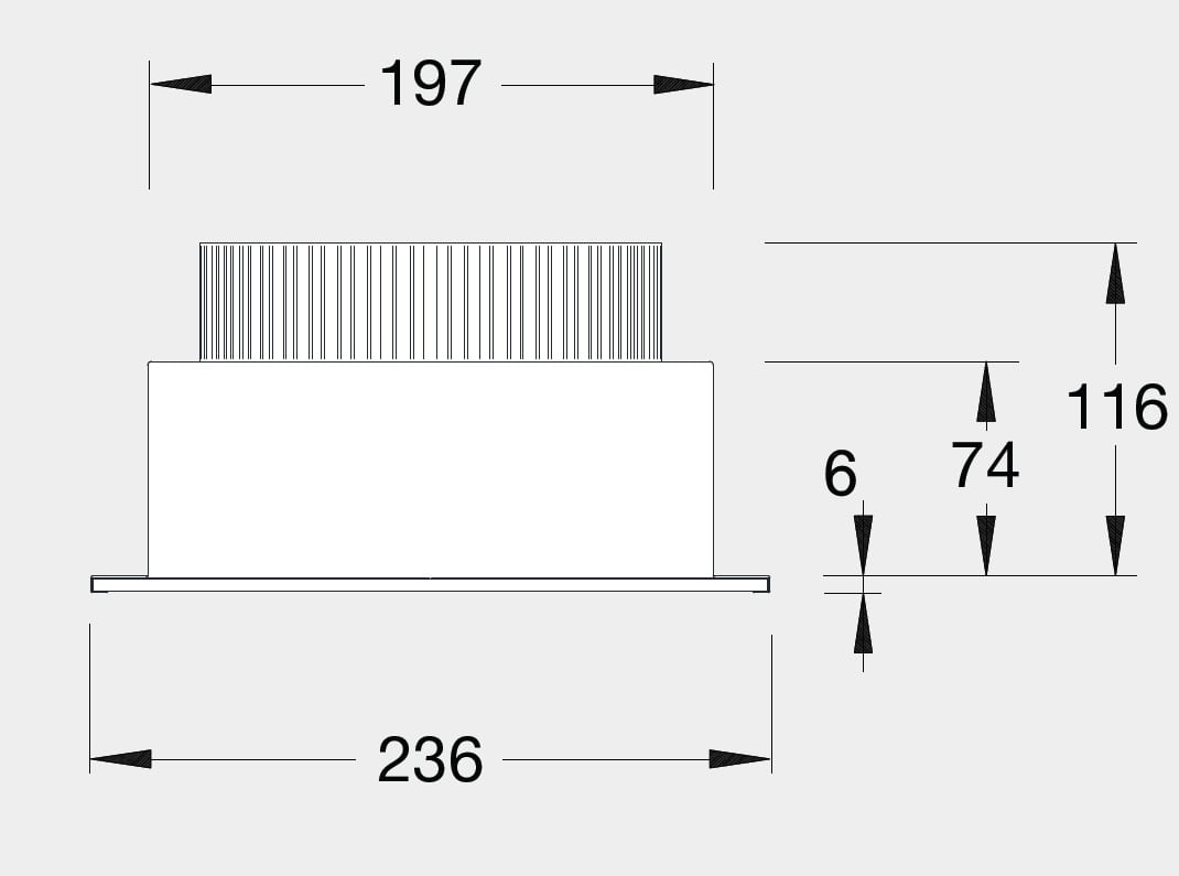 Rendimento luminoso 100%. Flusso luminoso dell'apparecchio 1578 lm. Distribuzione diretta simmetrica. UGR <24 (EN 12464-1). Efficienza apparecchio 58 lm/W. Durata utile (L85/B10): 50.000 h. (Tj 65°C). Corpo in acciaio verniciato di colore bianco. Dissipatore passivo di calore in alluminio anodizzato, sovradimensionato, per un ottimale gestione termica del modulo LED. Recuperatore di flusso in alluminio a specchio con trattamento superficiale al titanio e magnesio, assenza di iridescenza. Vetro opale smaltato, temprato, spessore 4 mm. Fissaggio vetro a incastro nelle sedi laterali in alluminio a specchio. Staffe di fissaggio in acciaio zincato. Cuffie in policarbonato copri asole. Dimensioni: 235x235 mm, altezza 120 mm. Peso 3,5 kg. Grado di protezione IP44 parte in vista. Resistenza meccanica 6,5 joule. Resistenza al filo incandescente 960°C. Unità di cablaggio separata. Cablaggio elettronico, 230V-50/60Hz, fattore di potenza >0,90, corrente costante in uscita, SELV, classe I. Modulo LED compatto da 26W/840, temperatura di colore 4000 K. Resa cromatica Ra >80.