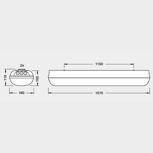Corpo in policarbonato autoestinguente V2, stampato ad iniezione, colore grigio RAL 7035. Guarnizione di tenuta, ecologica, antinvecchiamento, iniettata. Schermo in policarbonato fotoinciso internamente, autoestinguente V2, stabilizzato agli UV, stampatoad iniezione, con superficie esterna liscia, apertura antivandalica. Riflettore portacablaggio in acciaio zincato a caldo, verniciato a base poliestere bianco, fissato al corpo mediante dispositivi rapidi in acciaio, apertura a cerniera. Scrocchi a scomparsa filo corpo, in acciaio inox, per fissaggio schermo. Dimensioni: 160x1570 mm, altezza 100 mm. Peso 3,7 kg. Grado di protezione IP65. Possibilità di accesso all'interno dell'apparecchio per addetti ai lavori. Apparecchio a temperatura superficiale limitata. - D - Resistenza meccanica IK10 (20 joule). Resistenza al filo incandescente 850°C. Certificato TUV Rheinland-LGA per ambienti alimentari. Cablaggio elettronico, 230V-50/60Hz, fattore di potenza >0,90, corrente costante in uscita, classe I. Potenza dell'apparecchio 68 W. CE - IEC 60598-1 - EN 60598-1. Assil Quality. Temperatura ambiente da -20°C fino a +35°C. Modalità CF Corridor Function per dimmerazione e mantenimento al 10% del flusso luminoso in mancata presenza, grazie al sensore di presenza adalta frequenza presente all'interno dell'apparecchio. 2 moduli LED lineari da 30W/840, temperatura di colore 4000 K. Resa cromatica Ra >80. Staffe di fissaggio in acciaio inox. LED 2x30W, 8749lm, 4000K.
