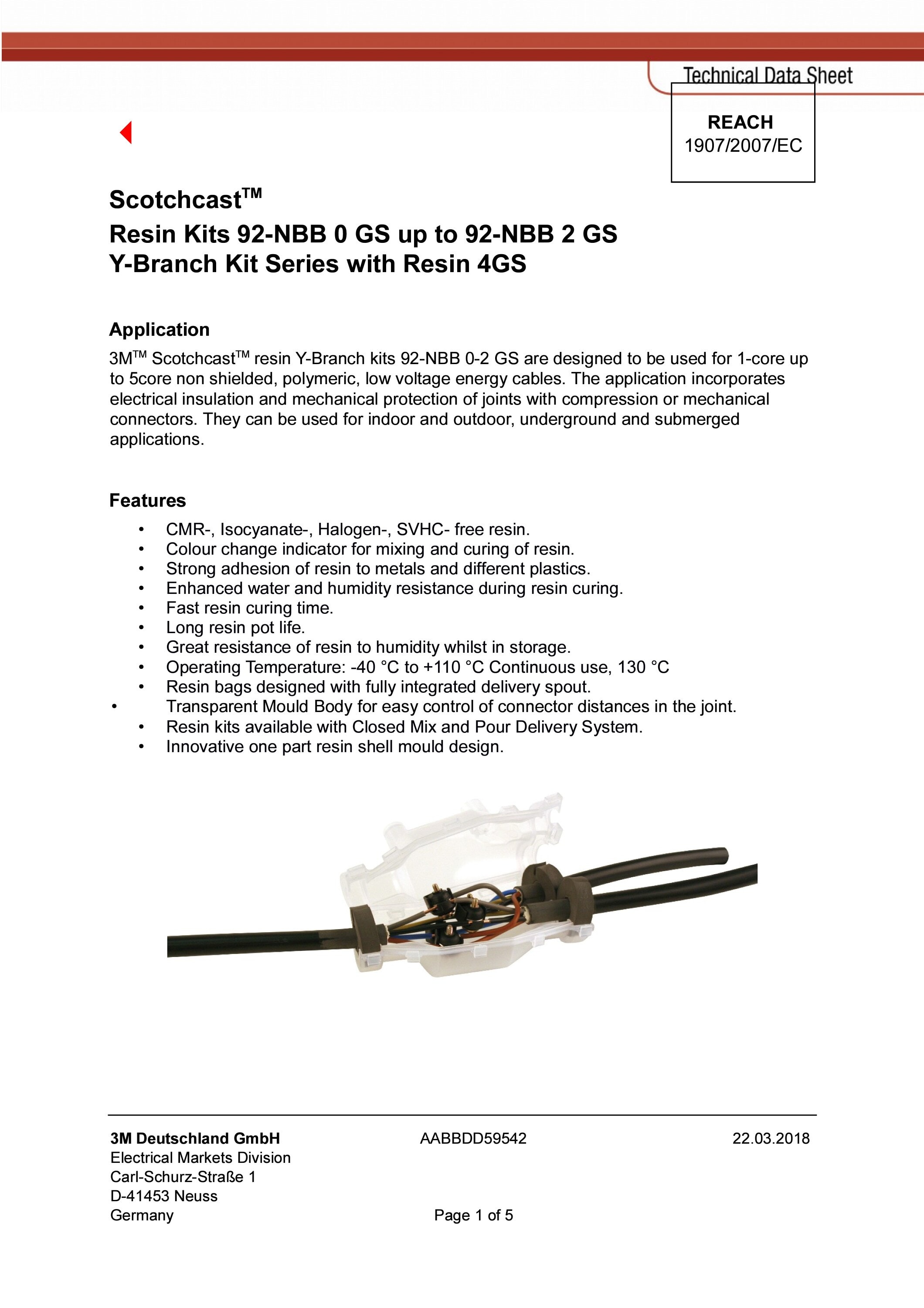 Kit per giunzione in linea 3M™ Scotchcast™ 92-NBA6, 1 kV,(27-54 mm) Il kit in resina poliuretanica per giunture della conduttura Premium In per usi generici 3M™ Scotchcast™ è conforme alla direttiva RoHS. La linea di serie 92-NBA è adatta per applicazioni fino a 1 KV coprendo la sezione trasversale del cavo principale per dimensioni che vanno da 1,5 mm2 a 240 mm2. Il design del kit serie 92-NBA consente una facile e rapida installazione grazie al nuovo beccuccio brevettato 3M™ integrato nel sacchetto in resina e nel contenitore del kit. L'impostazione corretta dei cavi viene assicurata dalla completa trasparenza del contenitore del kit. La resina poliuretanica 3M™ Scotchcast™ 40 idrorepellente è conforme agli standard CENELEC HD631.1 S2 e alle direttive UE 2002/95/EC (RoHS) e UE 1907/2007/EC (REACH), garantendo così il maggior grado di isolamento elettrico per applicazioni professionali.