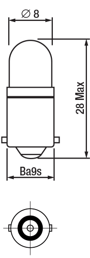 Segnalatore LED. Chip del LED protetto da lente trasparente in resina epossidica, Ø 8 mm. Anello in plastica dello stesso colore della luce emessa dal LED. LED verde 24/28V BA9S