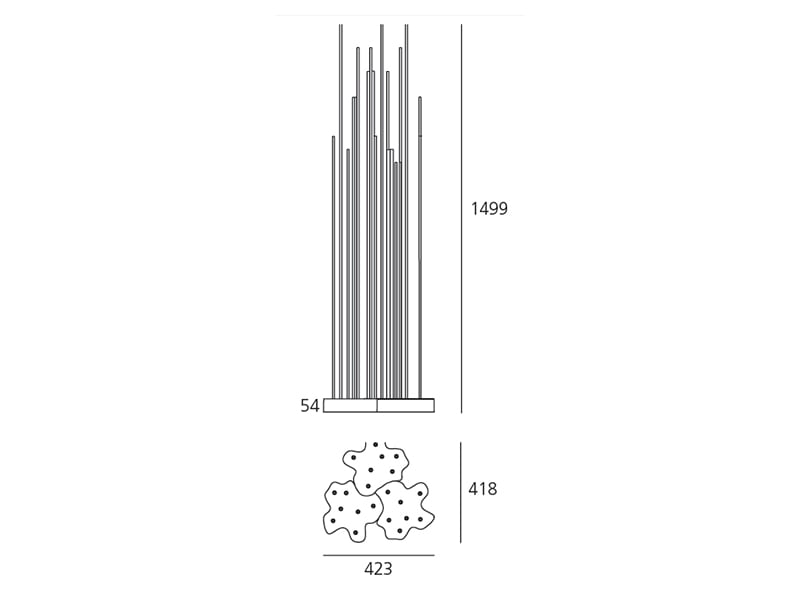 Reeds IP67 Triplo. Apparecchio di illuminazione da terra a luce diffusa che impiega sorgenti a LED monocromatici.Disponibile con gradi di protezione IP20 per interno, IP67 e IP68 per esterno. Le versioni IP67 e IP68 sonodisponibil in forma Singola o Tripla. La luce si diffonde attraverso 7 aste in PMMA aventi altezze diverse per dare l’impressione di un canneto e avvitabili alla base grazie a bussole in acciaio INOX AISI 316. Parte della luce si diffonde sul suolo anche attorno alla base stessa. La base, di forma irregolare, è studiata per consentire l’incastro «a mosaico» con altri apparecchi in modo da creare una composizione articolata a piacimento. Caratteristiche tecniche conformi alla EN60598-1 (IP20 e IP67) e parte 2-18 (IP68). Composto da unabase costituita da un involucro in policarbonato trasparente montato tra 2 piastre in acciaio INOX AISI316 serrate con viti in acciaio INOX AISI316 . La tenuta all’acqua è garantita da una guarnizione siliconica. L’apparecchio può essere fissato a terra grazie ai fori inseriti nella piastra inferiore. Coperchio estetico in tecnopolimero. Completo di alimentatore integrato e fornito con 1,5 m di cavo H05RN-F 2x1 provvisto di connettore IP67 per la connessione elettrica alla rete idoneo per cavi di diametro 5-13,5mm.