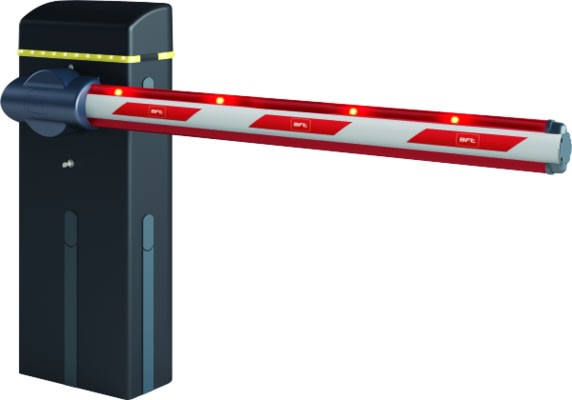 Barriera con motore a 24 V per passaggio utile fino a 8 m e tempo di apertura 8 sec. Reazione all'urto tramite . Centrale di comando con slot ULink, display e ricevente in testata. Colore grigio RAL 7015