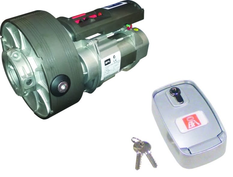 Kit per serrande. Il kit comprende: 1 operatore per serrande con puleggia portamolle diametro 200-220 mm. Coppia massima 130Nm e potenza assorbita pari a 400 W. Sblocco con cavo in acciaio e pomello per elettrofreno. (cod. P910042 00002); 1 cassaforte da muro per sblocco a cavo in acciaio e comando elettrico (cod. N574039)