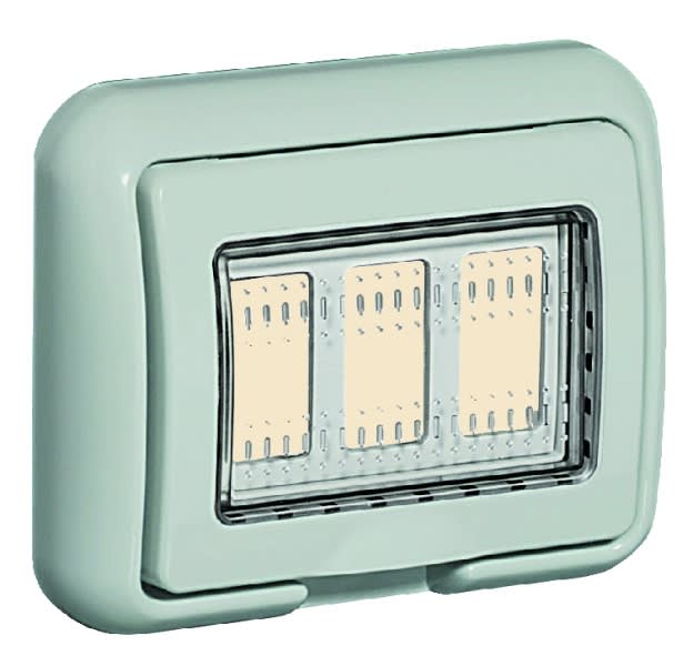 coperchio IP55 per installazione incassata in scatola 503E di 3 moduli Màtix - colore grigio RAL7035. Nota: il grado di protezione IP55 si ottiene a coperchio chiuso e con articolo installato su pareti lisce, senza scanalature ed impermeabili (piastrellelisce, marmo)