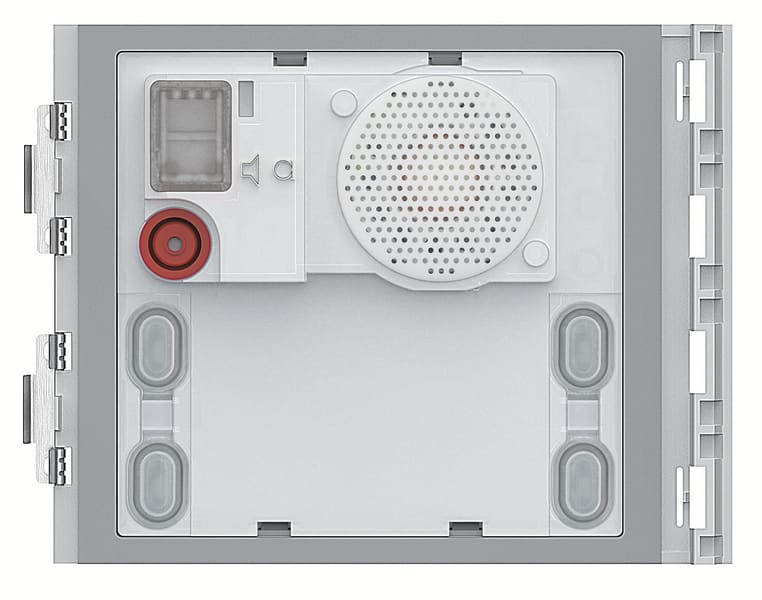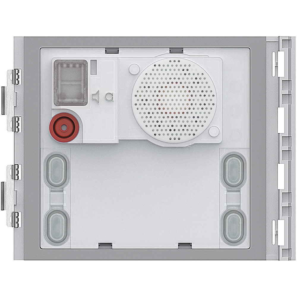 Modulo fonico base Sfera per la realizzazione di impianti citofonici 2 fili. Dotato di regolazioni volume altoparlante e microfono. Gestisce fino ad un massimo di 100 chiamate a pulsanti, utilizzando moduli pulsanti doppia fila aggiuntivi. Consente l\'attivazione di una elettroserratura collegata direttamente ai morsetti S+ ed S- (18 V 4 A impulsivi - 250 mA mantenimento su 30 ohm max) ed il collegamento di un pulsante apriporta locale sui morsetti PL. Da completare con frontale di finitura. Il dispositivo deve essere configurato fisicamente.
