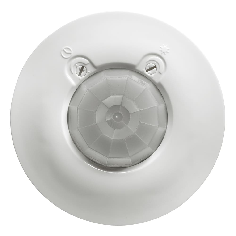 Switch Sensor ad infrarosso passivo per il rilevamento del movimento e del livello di illuminamento, tecnologia  “Zero Crossing”, gestione ON/OFF del carico, installazione ad incasso nel soffitto tramite molle o scatola da incasso, grado di protezione IP41, connessione a morsetti a vite, area di copertura circolare di diametro 8 m per un’altezza di installazione di 2.5 m, altezza massima di installazione di 6 m, alimentazione 240 Va.c., 50/60 Hz, carico massimo di 4.3 A a 230 Va.c., regolazione tramite trimmer del livello di illuminamento da 10 lux a 1275 lux e del tempo di ritardo da 10 s a 10 min.