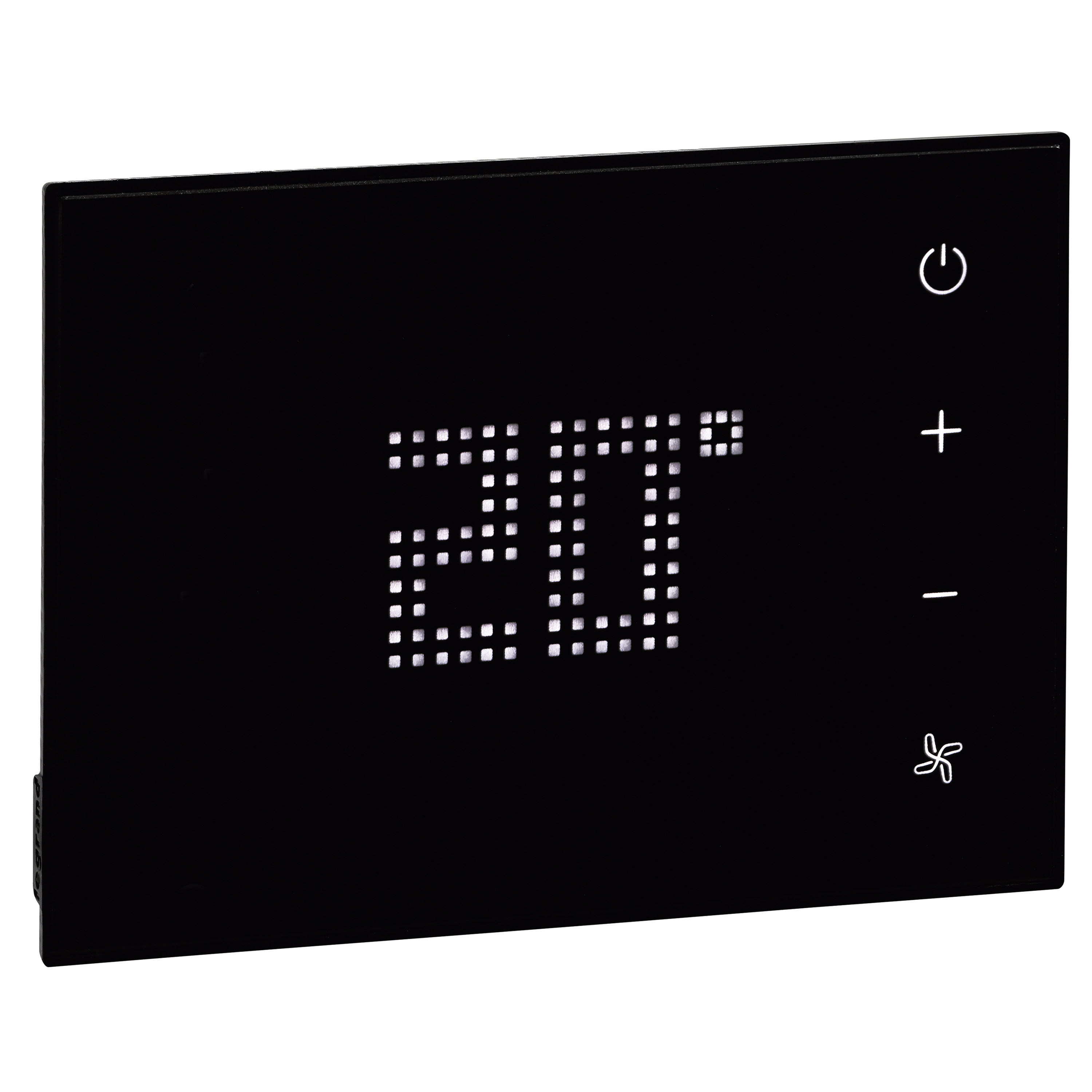 Sonda di temperatura con display Touch retroilluminato con finitura placca colore NERO in materiale plastico. Permette il controllo della temperatura di una singola zona.É dotato di una sonda di temperatura e di un ingresso per il collegamento di una linea contatti (es. contatto finestra).Permette la gestione di diverse tipologie di impianto e la regolazione della velocità della ventola in caso di impiego di Fan-Coils.Possibilità di funzionamento automatico (estate/inverno) con impianti compatibili.Collegamento a SCS-BUS - Dimensioni: 3 moduli.