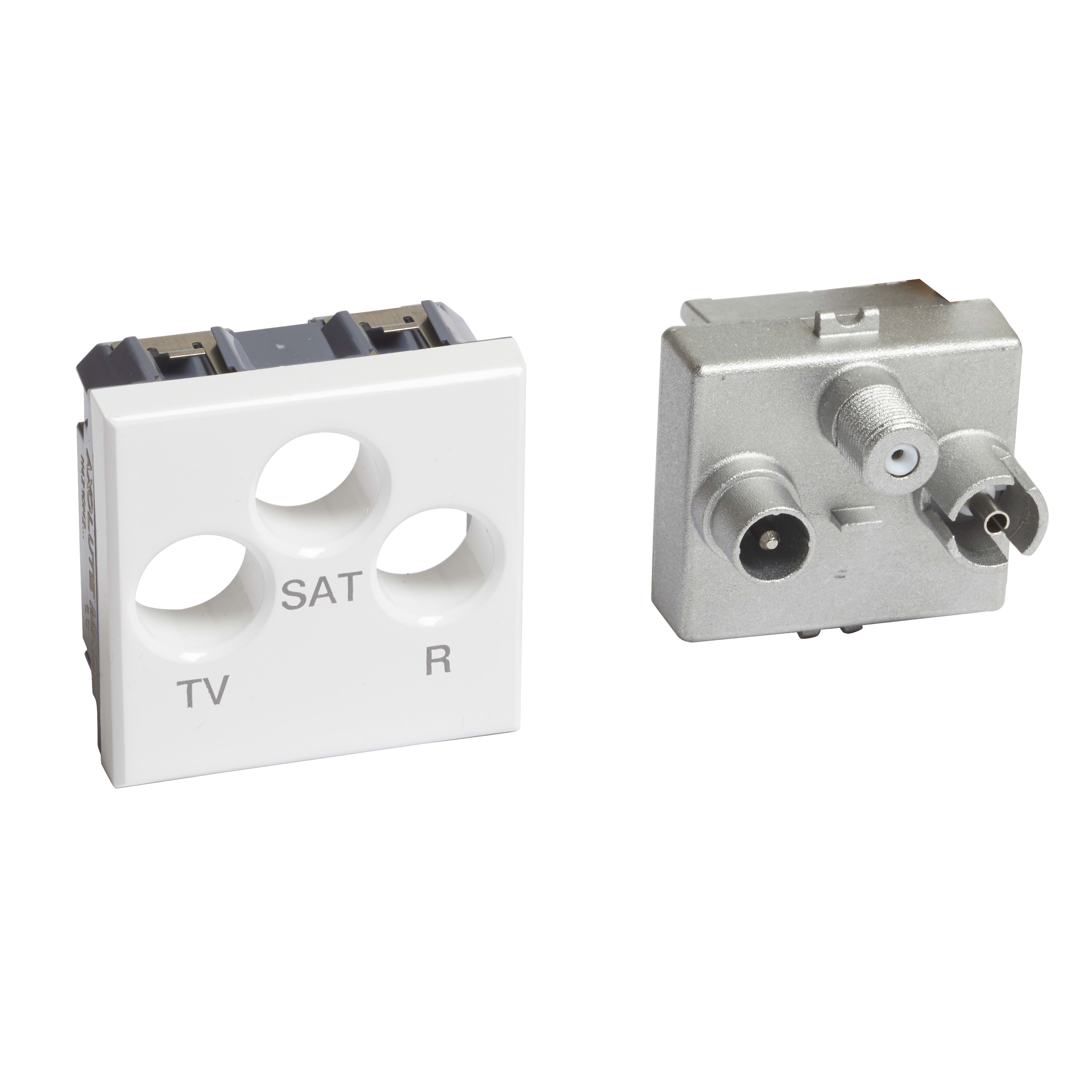 presa coassiale diretta demiscelata per impianti di antenna TV monoutenza anche telealimentati e centralizzati in derivazione, impianti via satellite monoutente e centralizzati in derivazione con passaggio di corrente e di segnale per la selezione dei canali, ed impianti radio - connettore TV maschio Ø 9,5 mm - connettore SAT tipo F e radio femmina Ø 9,5 mm - fornita in confezione con motore neutro e mostrine di finitura negli stessi colori dei meccanismi - 2 moduli