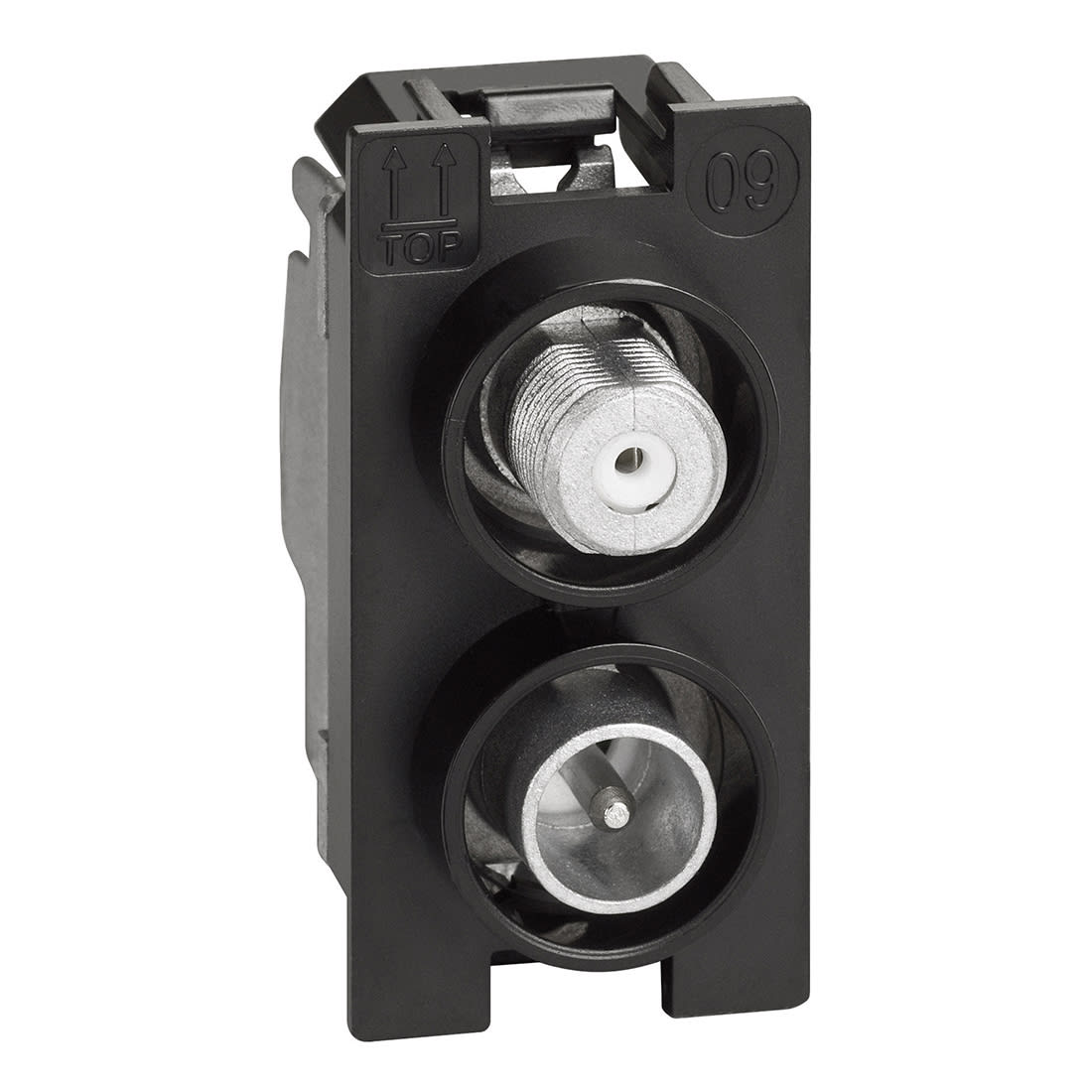 Presa coassiale diretta demiscelata per impianti di antenna TV monoutenza anche telealimentati e centralizzati in derivazione, impianti via satellite monoutente e centralizzati in derivazione con passaggio di corrente e di segnale per la selezione dei canali - connettore TV maschio Ø 9,5 mm - connettore SAT tipo F - 1 modulo