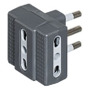 Adattatore TRIS con 3 prese bipasso 10/16A e spina 16A di colore antracite. Venduto in blister 90x122 mm (LxA)