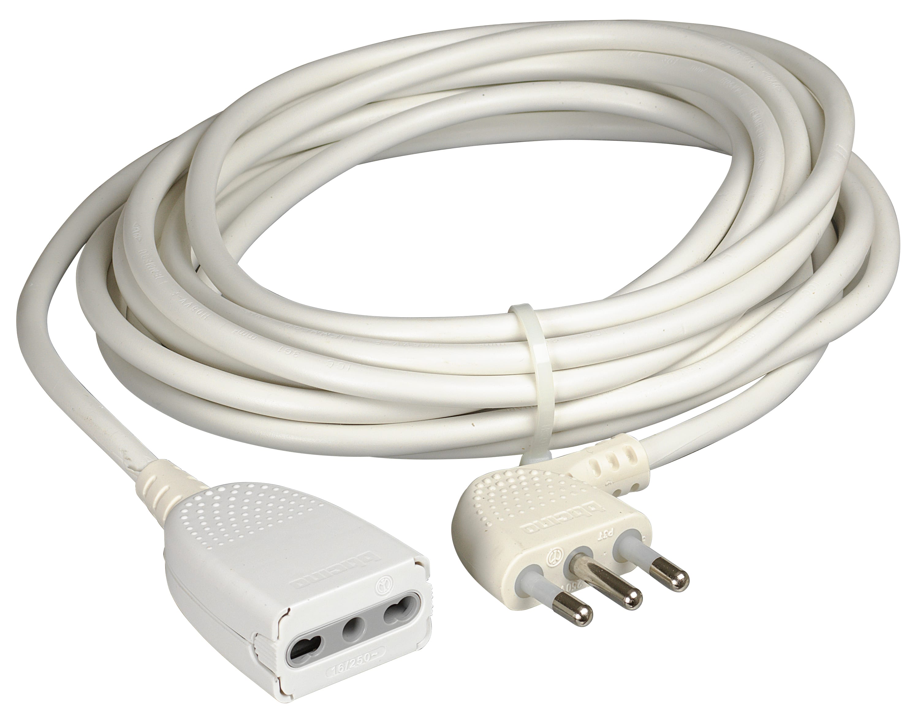 Prolunga domestica 2P+T 3x1mmq lunghezza 5m con spina 2P+T 16A e presa bipasso 10/16A - colore bianco
