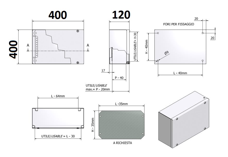 Cassetta di derivazione con corpo in lamiera pressopiegata e saldata sp. 12/10 e coperchio in lamiera sp. 12/10 fissato con viti. Piastra interna in lamiera sp. 15/10 sendzimir, guarnizioni, poliuretaniche applicate in colata continua. Verniciatura con polveri epossipoliestere termoindurenti in tinta RAL7035 bucciato. Grado di protezione IP 55 - TYPE 12.
