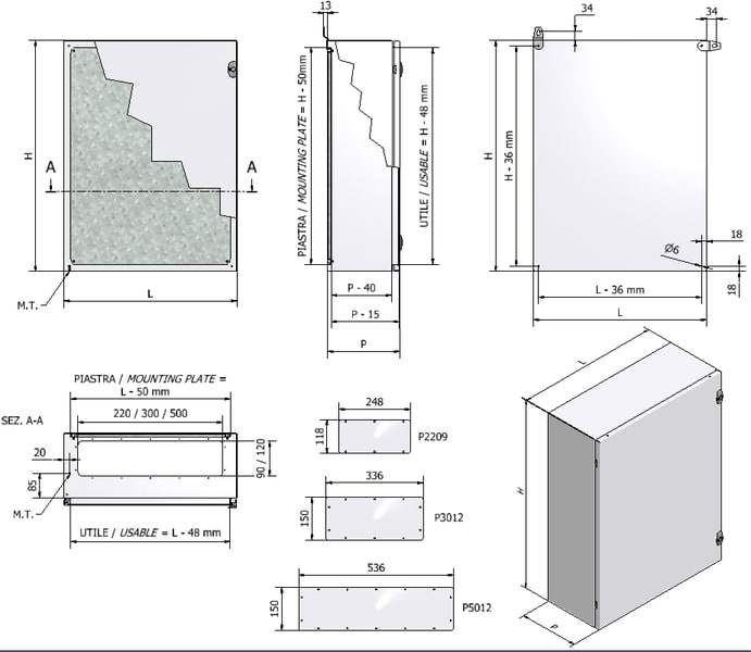 Cassetta composta da corpo, porta cieca esterna, piastra interna fissata sul retro e piastra passacavi • Corpo in lamiera pressopiegata e saldata sp. 12-15/10 • Porta in lamiera sp. 15-20/10 • Piastra interna in lamiera sp. 15-20/10 sendzimir • Guarnizioni, poliuretaniche applicate in colata continua • Cerniere reversibili con apertura 110° • Serratura con impronta doppia aletta • Verniciatura con polveri epossipoliestere termoindurenti in tinta RAL7035 bucciato • Grado di protezione IP 66 - TYPE 4