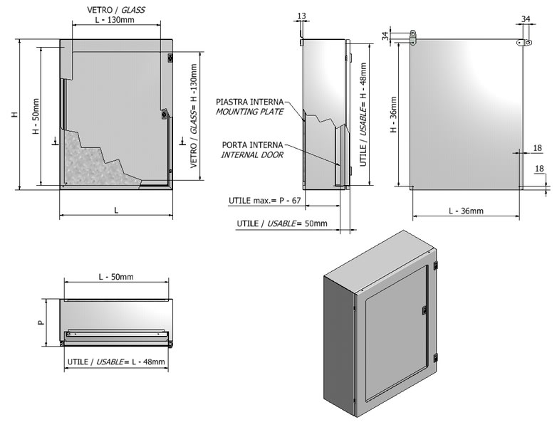 Cassetta composta da corpo, porta esterna trasparente, porta interna, piastra interna fissata sul fondo. • Con corpo in acciaio inox AISI304 satinato scotch brite sp. 12/10 pressopiegato e saldato • Porta trasparente in acciaio inox AISI 304 satinato scotch brite sp. 12/10 • Piastra interna in lamiera sp. 15-20/10 sendzimir • Guarnizioni, poliuretaniche applicate in colata continua • Cerniere reversibili con apertura 110° • Serratura con impronta doppia aletta • Grado di protezione IP 65 - TYPE 12