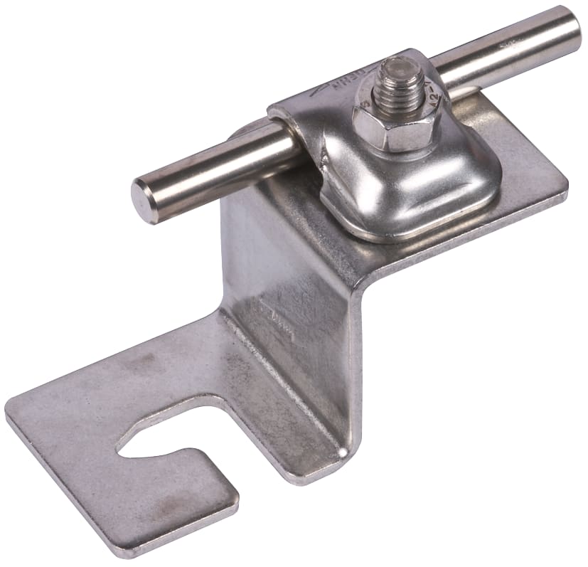 Staffa portafilo per tetti per il fissaggio di dispositivi di captazione supplementari come captatori su tetti metallici. Esecuzione per tetti trapezoidali da agganciare alle viti di fissaggio del tetto, con cavallotto di fissaggio, posa fissa del conduttore.