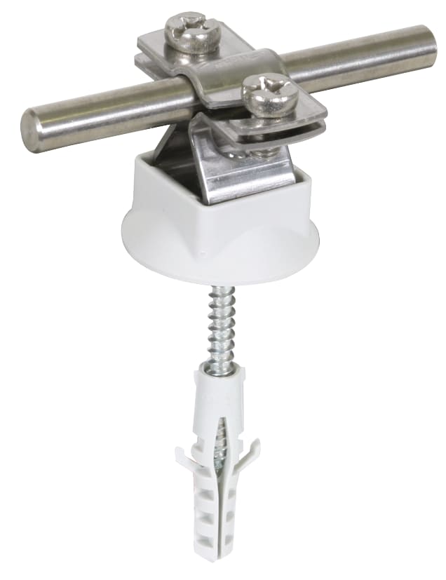 Staffa portafilo DEHNhold con cavallotto a fessura per il fissaggio di conduttori piatti. Utilizzabile per diversi materiali ad es. Al, INOX, Fe/tZn e Cu, posa fisa del conduttore. Esecuzione con filetto interno, premontata con vite, zoccolo in materialeplastico e tassello.
