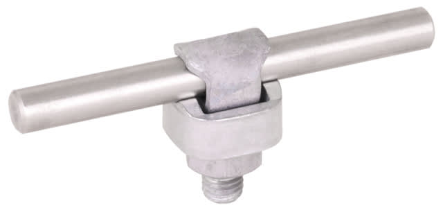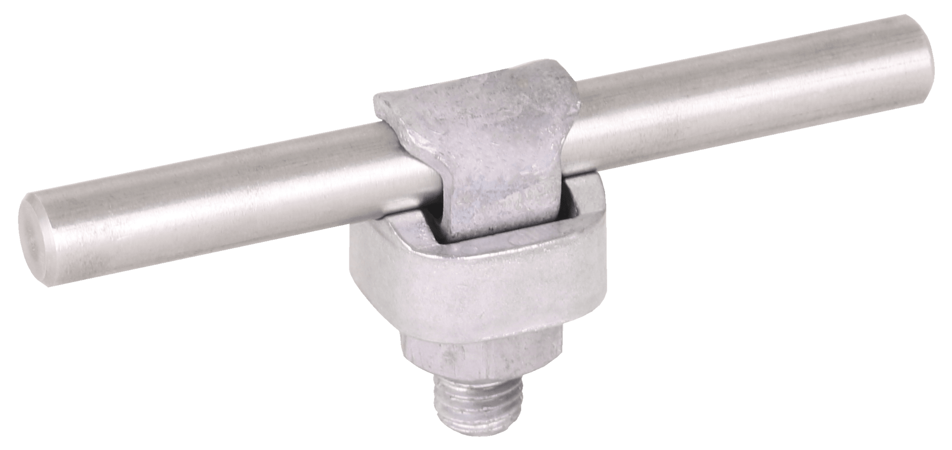 Connettore KS secondo CEI EN 62561-1, per la connessione a portata di corrente di fulmine di conduttori tondi p.es. a profilati piatti, fascette per pluviali oppure altre parti dell’impianto LPS. Esecuzione a corpo unico Fe/tZn con vite e dado M10.