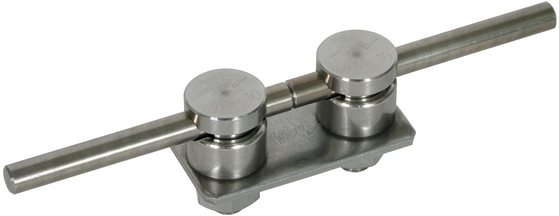 Piastra di connessione per la connessione della conduttura HVI alla punta di captazione (D10 mm) con due connettori KS. Si può utilizzare anche come connettore KS secondo CEI EN 62561-1, per la connessione resistente a corrente di fulmine di conduttori tondi. Esecuzione a due componenti, connettore distanza 40 mm, con vite e dado M10.