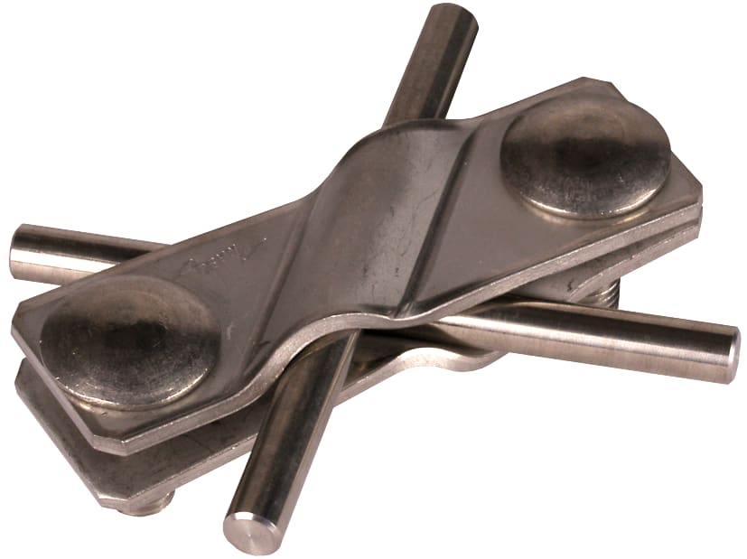 Morsetto di collegamento obliquo secondo CEI EN 62561-1, per collegamenti a croce e a "T"di conduttori tondi e piatti. Esecuzione con antisvitamento delle viti M10.