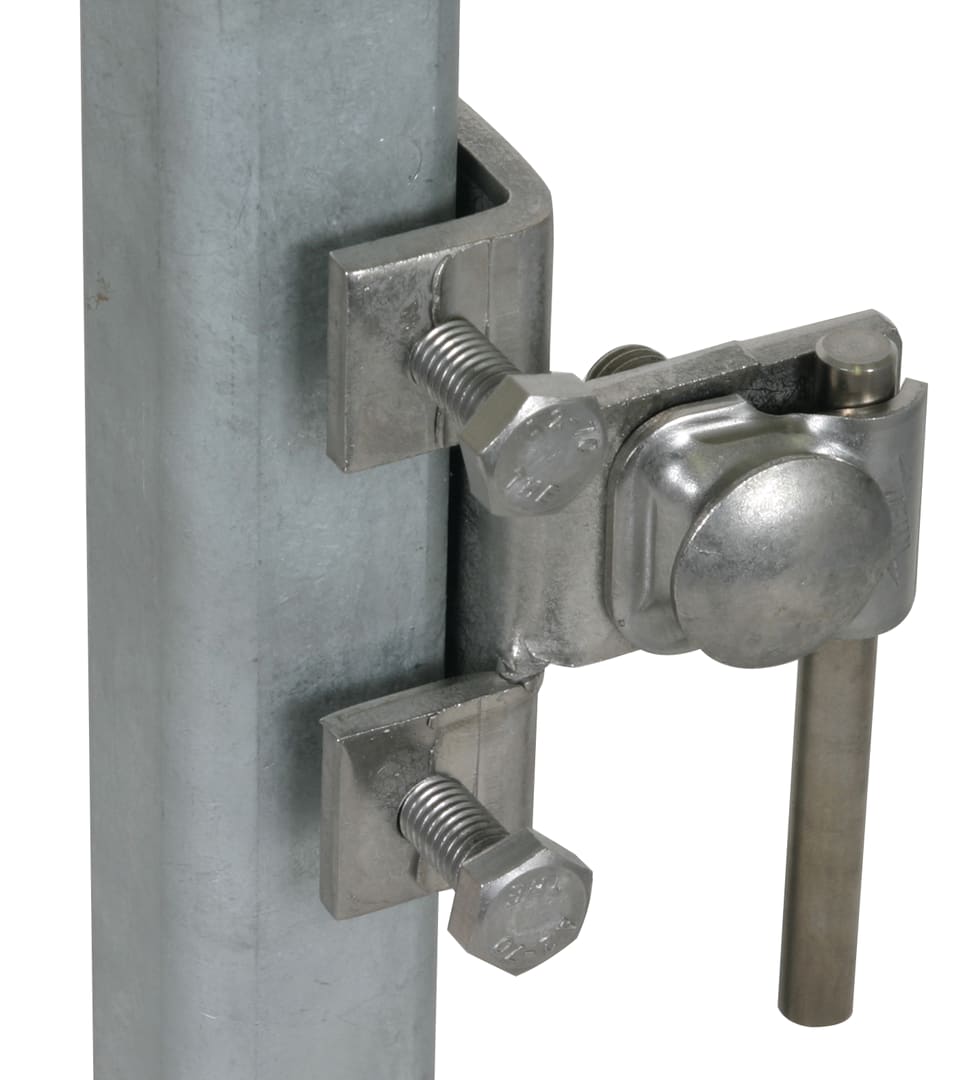 Morsetto di collegamento per travi d'acciaio secondo CEI EN 62561-1 per il collegamento su costruzioni d'acciaio. Esecuzione verticale con cavallotto di fissaggio, connessione longitudinale o trasversale.