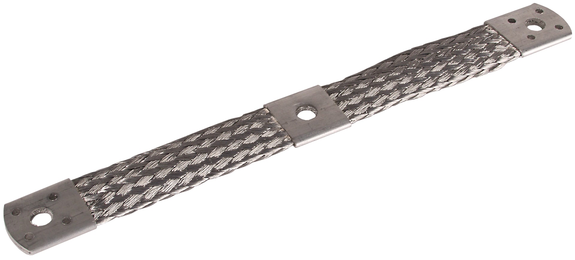 Treccia di ponticellamento secondo CEI EN 62561-1 per il collegamento di rivestimenti metallici (rivetti) oppure come elemento di compensazione della dilatazione per conduttori tondi. Esecuzione lunga, anche per punti d'incrocio, connessione p.es. con connettore KS.