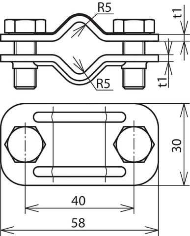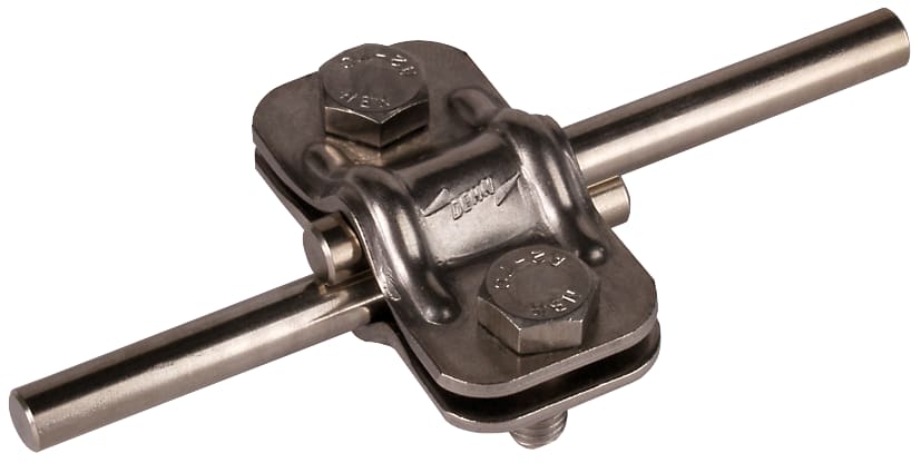 Morsetto di sezionamento UNI secondo CEI EN 62561-1, per il collegamento della calata con l’adduzione a terra. Esecuzione senza piastra intermedia per due conduttori tondi.