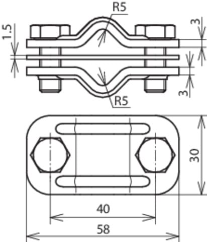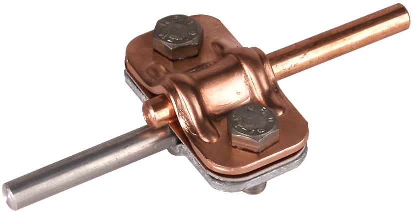 Morsetto di sezionamento UNI secondo CEI EN 62561-1 per il collegamento della calata con l’adduzione a terra. Esecuzione bimetallica per due conduttori tondi in Cu e Fe/tZn oppure INOX (AISI 316).