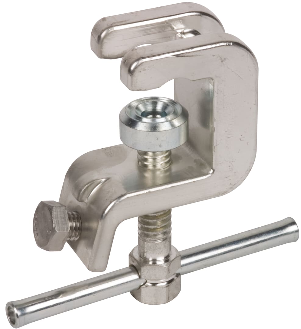 Pinza di terra universale con barretta di rotazione come elemento di connessione sul lato terra secondo la norma EN/IEC 61230 (DIN VDE 0683-100) per punti fissi a sfera, punti fissi a T, conduttori piatti e tondi per l'equipaggiamento sul lato terra di corde di terra e di corto circuito. Con dispositivo antirotazione, esecuzione PK1.