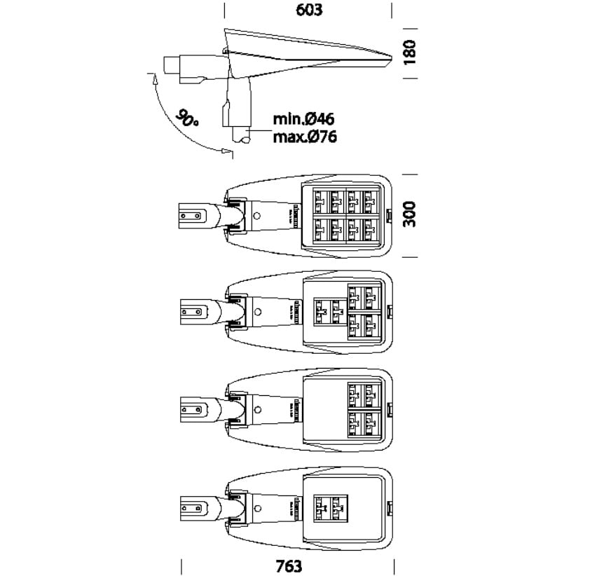 Corpo e coperchio: stampati in alluminio pressofuso e disegnati con una sezione aerodinamica a bassa superficie di esposizione al vento. Alette di raffreddamento integrate nella copertura. Ottiche: in alluminio rivestito con argento ad altissima purezza99.99% ottenuto con procedimento sotto vuoto (PVD). Attacco palo: in alluminio pressofuso idoneo per pali di diametro da min. 46mm a max. 76mm orientabile da 0° a 20° per applicazione a frusta e da 0° a 20° per applicazione a testa palo. Passo di inclinazione pari a 5°. Diffusore: vetro extra-chiaro sp. 4mm temperato resistente agli shock termici e agli urti (UNI-EN12150-1: 2001). Verniciatura: a polvere con resina a base poliestere, resistente alla corrosione e alle nebbie saline; finitura con resinaacrilica di colore grafite oppure argento stabilizzata ai raggi UV. Dotazione: sezionatore in doppio isolamento che interrompe l’alimentazione elettrica all’apertura della copertura. Munito di dispositivo elettronico dedicato alla protezione del modulo LED e completo di connettore per una rapida installazione. A richiesta: dispositivo di protezione conforme alla norma EN 61547 contro i fenomeni impulsivi atto a proteggere il modulo LED e il relativo alimentatore. - classe 2 (protezione fino a 10KV). Normativa: prodotti in conformità alla norma EN60598 (CEI 34 – 21). Hanno grado di protezione secondo la norma EN60529. LED: Fattore di potenza: =0,92 Mantenimento del flusso luminoso al 70%: 50.000h (L70B20). Lampada: LED white 39W 5400lm @ 700mA-4000K-CRI 70. Colore: Grafite.