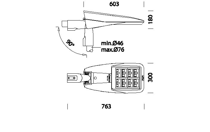 Corpo e coperchio: stampati in alluminio pressofuso e disegnati con una sezione aerodinamica a bassa superficie di esposizione al vento. Alette di raffreddamento integrate nella copertura. Ottiche: in alluminio rivestito con argento ad altissima purezza99.99% ottenuto con procedimento sotto vuoto (PVD). Attacco palo: in alluminio pressofuso idoneo per pali di diametro da min. 46mm a max. 76mm orientabile da 0° a 20° per applicazione a frusta e da 0° a 20° per applicazione a testa palo. Passo di inclinazione pari a 5°. Diffusore: vetro extra-chiaro sp. 4mm temperato resistente agli shock termici e agli urti (UNI-EN12150-1: 2001). Verniciatura: a polvere con resina a base poliestere, resistente alla corrosione e alle nebbie saline; finitura con resina acrilica di colore grafite oppure argento stabilizzata ai raggi UV. Dotazione: sezionatore in doppio isolamento che interrompe l’alimentazione elettrica all’apertura della copertura. Munito di dispositivo elettronico dedicato alla protezione del modulo LEDe completo di connettore per una rapida installazione. LED: Fattore di potenza: =0,92. Mantenimento del flusso luminoso al 70%: 80.000h (L70B20). LED 38W - 6000lm - CRI 70 - 350mA - 4000K. Colore: Argento sabbiato.