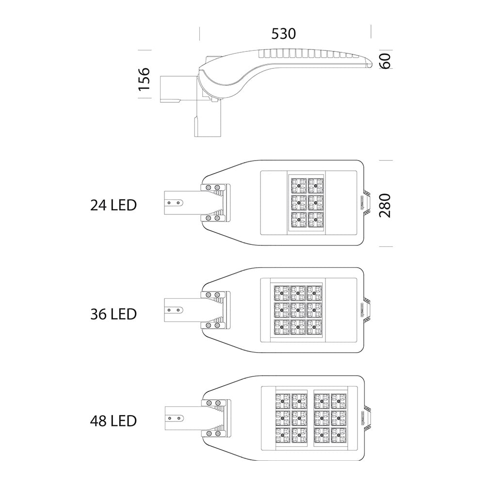 3376 Mini Stelvio - high performance - grandi aree - Corpo e telaio: In alluminio pressofuso e disegnati con una sezione e bassissima superficie di esposizione al vento. Alette di raffreddamento integrate nella copertura. Attacco palo: In alluminio pressofuso è provvisto di ganasce per il bloccaggio dell’armatura secondo diverse inclinazioni. Orientabile da 0° a 15° per applicazione a frusta; e da 0° a 10° per applicazione a testa palo. Passo di inclinazione 5° Idoneo per pali di diametro 63-60mm. Ottiche: Sistema a ottiche combinate realizzate in PMMA ad alto rendimenti resistente alle alte temperature e ai raggi UV. Diffusore: vetro trasparente sp. 4mm temperato resistente agli shock termici e agli urti (UNI-EN 12150-1 : 2001). Verniciatura: il ciclo di verniciatura standard a polvere è composto da una fase di pretrattamento superficiale del metallo e successiva verniciatura a mano singola con polvere poliestere, resistente alla corrosione, alle nebbie saline e stabilizzata ai raggi UV. Dotazione: Dispositivo di controllo della temperatura all’interno dell’apparecchio con ripristino automatico. Dispositivo di protezione conforme alla EN 61547 contro i fenomeni impulsivi atto a proteggere il modulo LED e il relativo alimentatore. Opera in due modalità: modo differenziale: surge tra i conduttori di alimentazione, ovvero tra il conduttore di fase verso quello di neutro, modo comune: surge tra i conduttori di alimentazione, L/N, verso la terra o il corpo dell’apparecchio se quest’ultimo è in classe II e se installato su palo metallico. A richiesta: apparecchio in classe II, protezione fino a 10KV. Equipaggiamento: Completo di connettore stagno IP67 per il collegamento alla linea. Dissipatore: Il sistema di dissipazione del calore è appositamente studiatoe realizzato per permettere il funzionamento dei LED con temperature inferiori ai 50° (Tc = 25°) garantendo ottime prestazioni/rendimento ed un’ elevata durata di vita. Ottiche: Sistema a ottiche combinate realizzate in PMMA ad alto rendimento resistentealle alte temperature e ai raggi UV. Tecnologia LED di ultima generazione Ta-30+40°C vita utile 80%: 50.000h (L80B20). Classificazione rischio fotobiologico: Gruppo di rischio esente. Fattore di potenza >0.9. LED 60W 7669lm 4000K CRI 70. Antracite.