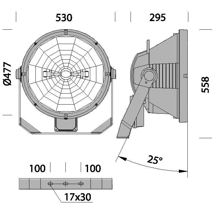 CORPO/TELAIO: In alluminio pressofuso, con alettature di raffreddamento. RIFLETTORE: In alluminio 99.98, ossidato anodicamente e brillantato con aletta di recupero del flusso luminoso. DIFFUSORE: Vetro temperato sp. 5 mm resistente agli shock termici e agli urti (prove UNI EN 1250-1:2001). VERNICIATURA: a polvere poliestere colore grigio grafite resistente alla corrosione e alle nebbie saline. PORTALAMPADA: In ceramica e contatti argentati. Attacco a cavo. CABLAGGIO: Alimentazione 230V/50Hz. Cavetto flessibile capicordato con puntali in ottone stagnato, isolamento in silicone con calza in fibra di vetro, sezione 2.5 mm². Morsettiera 2P+T in nylon con massima sezione dei conduttori ammessa 6 mm². EQUIPAGGIAMENTO: Pressacavo in nylon f.v. diam. 1/2 pollicegas. Dispositivo di protezione: al momento dell'apertura (a cerniera) della parte posteriore il contatto da normalmente chiuso si apre interrompendo l'alimentazione. Con mirino per il puntamento. Valvola di ricircolo aria. Completo di accenditore posto nell'apposita cassetta in dotazione. NORMATIVA: Prodotti in conformità alle vigenti norme EN60598-1 CEI 34-21, sono protetti con il grado IP66IK08 secondo le EN 60529. Hanno ottenuto la certificazione di conformità Europea ENEC. ALTRI CABLAGGI: Con cablaggio per la riaccensione a caldo. POTENZA LAMPADE: MAX-TS1000; MAX-TS2000. Superficie di esposizione al vento: 1800 cmq. Riaccensione a caldo con sottocodice -99.