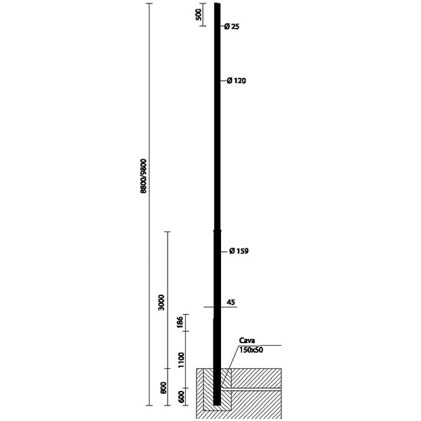 Pali in acciaio laminato a caldo, privo di saldature, spessore 4mm. Con finestra d'ispezione in alluminio pressofuso (186x45mm), completo di 2 portafusibile di protezione, 2 fusibili da 16A, morsettiera asportabile a 4 poli/3 vie = 10 mmq derivazione 2,5 mmq. Predisposto con foro per ingresso cavo di alimentazione. Per la versione con base è necessario acquistare 4 tirafondi da interrare, bulloneria e tappi. Di serie in classe di isolamento II. Attenzione quando si utilizzano apparecchi in classe di isolamento I prevedere le connessioni per la messa a terra. N.B.: La possibilità di accoppiare una composizione al palo è subordinata alla verifica della resistenza alla spinta del vento, nelle zone del territorio previste dal D.M.14/01/2008. Secondo le ipotesi di carico previste dalle norme EN 40-3-1.Si consiglia di effettuare un’ accurata e idonea protezione o isolamento delle superfici interessate e che non ci sia contatto diretto con la muratura fresca o il massetto. Argento sabbiato.