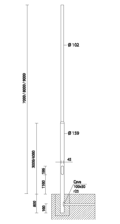 Palo in acciaio zincato a caldo spessore 4mm. Con finestra d'ispezione in alluminio pressofuso (186x45mm), completo di 2 portafusibile di protezione, 2 fusibili da 16A, morsettiera asportabile a 4 poli. Predisposto con foro per ingresso cavo di alimentazione. Per la versione con base è necessario acquistare 4 tirafondi da interrare, bulloneria e tappi. N.B.: La possibilità di accoppiare una composizione al palo è subordinata alla verifica della resistenza alla spinta del vento, nelle zone del territorio previste dal D.M.14/01/2008. Secondo le ipotesi di carico previste dalle norme EN 40-3-1.Si consiglia di effettuare un’ accurata e idonea protezione o isolamento delle superfici interessate e che non ci sia contatto diretto con la muratura fresca o il massetto.
