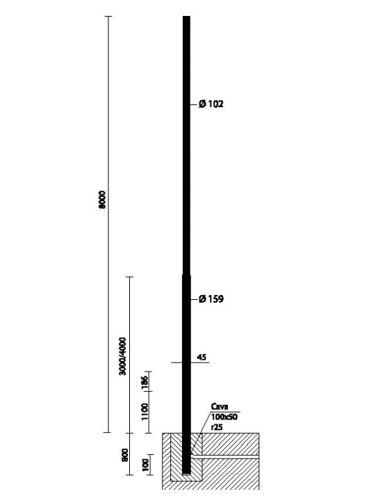 Palo in acciaio zincato a caldo spessore 4mm. Con finestra d'ispezione in alluminio pressofuso (186x45mm), completo di 2 portafusibile di protezione, 2 fusibili da 16A, morsettiera asportabile a 4 poli. Predisposto con foro per ingresso cavo di alimentazione. Per la versione con base è necessario acquistare 4 tirafondi da interrare, bulloneria e tappi. N.B.: La possibilità di accoppiare una composizione al palo è subordinata alla verifica della resistenza alla spinta del vento, nelle zone del territorio previste dal D.M.14/01/2008. Secondo le ipotesi di carico previste dalle norme EN 40-3-1.Si consiglia di effettuare un’ accurata e idonea protezione o isolamento delle superfici interessate e che non ci sia contatto diretto con la muratura fresca o il massetto. H:8800mm. Colore: Argento sabbiato.