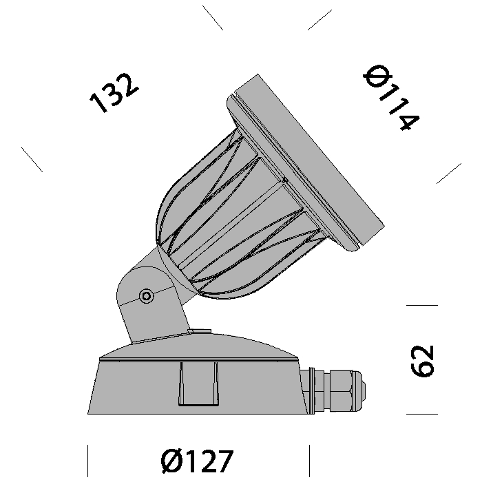 CORPO/TELAIO: In alluminio pressofuso, con ampie alettature di raffreddamento per un elevato smaltimento termico. BASE: In nylon f.v., infrangibile. DIFFUSORE: In vetro serigrafato, temperato. VERNICIATURA: In diverse fasi. Ad immersione in cataforesi epossidica, resistente alla corrosione e alle nebbie saline. La seconda con fondo per stabilizzazione ai raggi UV e per ultima finitura bugnata con vernice acrilica, argento metallizzato. PORTALAMPADA: In ceramica e contatti argentati. Attacco GU10. CABLAGGIO: Alimentazione a 230V. Cavetto in silicone con calza vetro sezione 1mm². Morsettiera 2P con massima sezione dei conduttori ammessa 2.5 mm². EQUIPAGGIAMENTO: Pressacavo diam. 3/8. NORMATIVA: Prodotte in conformità alle vigenti norme EN60598-1 CEI34-21 sono protette con il grado IP65IK08 secondo le EN 60529. Hanno ottenuto la certificazione di conformità Europea ENEC. Installabili su superfici normalmente infiammabili. In doppio isolamento. Funzionamento a tensione di rete senza trasformatore.