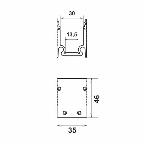Proline 3546 - Profilo in estruso di alluminio per l'installazione a plafone o sospensione. Disponibile nelle finiture di colore nero. Il diffusore in policarbonato è a filo bordo (non retratto). Cablato a richiesta con strip LED disponibili nella versione IP20 o IP65 inserita all'interno del profilo. L'alimentatore deve essere posizionato in remoto rispetto al Proline LED, si richiede predisposizione del vano di alloggiamento in fase progettuale. Copertura Opale. Kit composto da: profilo + tappi + diffusore + molle per il fissaggio (esclusa led strip). L1000 mm.