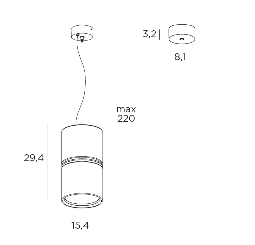 Apparecchio a sospensione monoemissione con sorgente luminosa a LED. Corpo e rosone in alluminio vercniciato grigio cemento. Sorgente Luminosa: LED 40W 4800Lm 3000K.