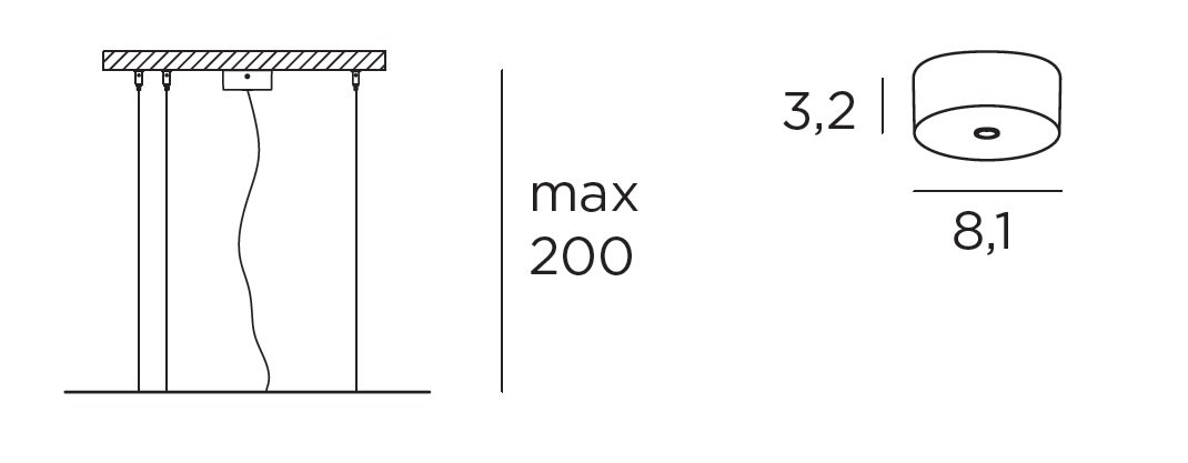 Kit sospensione con rosone in policarbonato bianco lucido, cavo elettrico 3x0,75mm² e cavi di sospensione in acciaio. Kit per montaggio a sospensione “monoemissione”. Per versione: ø26, 45, 65cm.