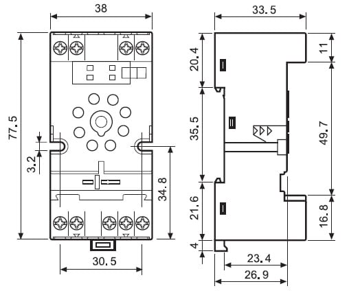 Zoccolo con morsetti a bussola Montaggio: barra cieca 35 mm (A): 10 Grado di protezione: IP 20 Accessori: Moduli di segnalazione e protezione EMC;pettine 6 poli;moduli temporizzatori;ponticello metallico