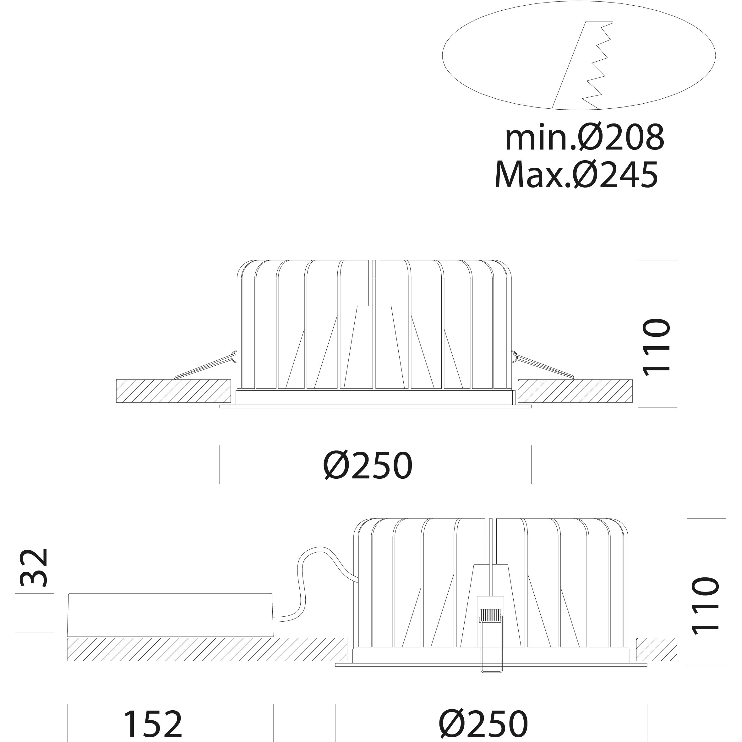 Jet 250 - IP44 - Corpo: faretto fisso in alluminio pressofuso con molle per incasso. Riflettore: ottica dark light in alluminio speculare antiriflesso che permette di ottimizzare l’efficienza luminosa. Lente: in policarbonato ad alta efficienza con bassissimo coefficiente di abbagliamento. Installazione: I faretti sono dotati di staffe di sostegno in acciaio zincato, con alloggiamento per molle di fissaggio al controsoffitto. Verniciatura: A polvere con vernice epossidica in poliestere resistente ai raggi UV. Equipaggiamento: Completo di staffa regolabile in acciaio. Normativa: Prodotti in conformità alle norme EN 60598-1-CEI 34.21, hanno grado di protezione IP44 secondo le norme EN 60529. Fattore di potenza: ≥0,9. Classificazione rischio fotobiologico:gruppo esente. Mantenimento del flusso luminoso al 80%: 50.000h (L80B20). diam. incasso 208/248mm. Alimentatore elettronico. LED COB 51W 5618lm 4000K CRI 90. Bianco.
