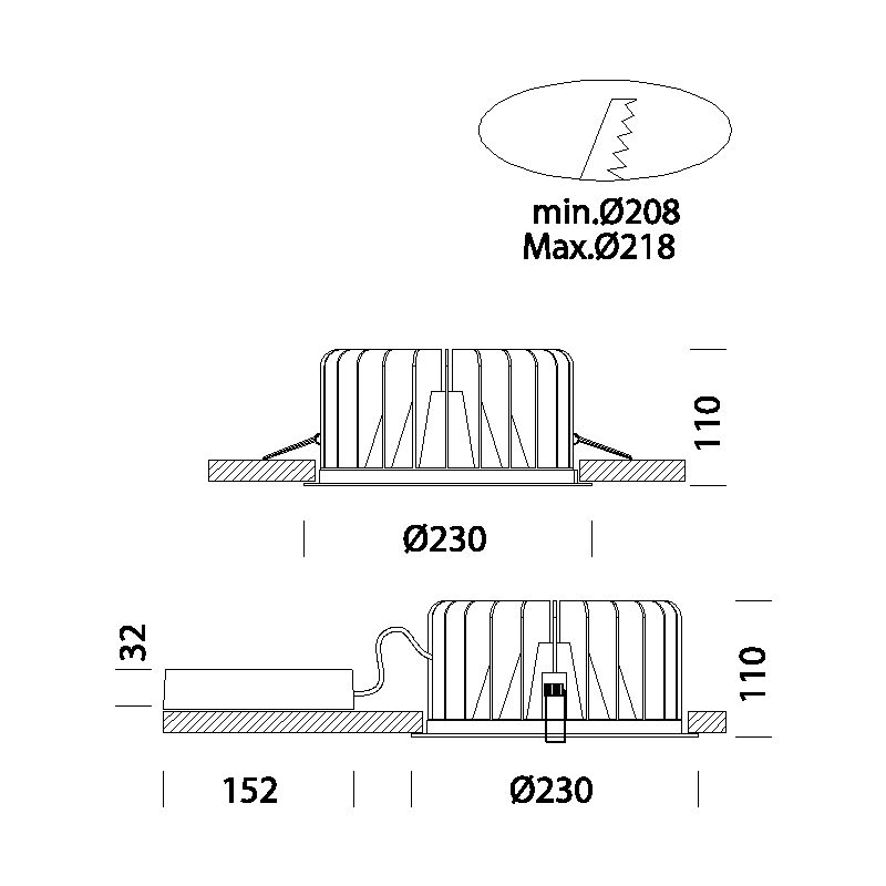 Corpo: faretto fisso in alluminio pressofuso con molle per incasso. Riflettore: ottica dark light in alluminio speculare antiriflesso che permette di ottimizzare l’efficienza luminosa. Installazione: I faretti sono dotati di staffe di sostegno in acciaiozincato, con alloggiamento per molle di fissaggio al controsoffitto. Verniciatura: A polvere con vernice epossidica in poliestere resistente ai raggi UV. Equipaggiamento: Completo di staffa regolabile in acciaio. Normativa: Prodotti in conformità alle norme EN 60598-1-CEI 34.21, hanno grado di protezione IP65 secondo le norme EN 60529. LED: ad alta efficienza 5100lm - 60W - 4000K - CRI 80 Fattore di potenza: ≥0,9 Classificazione rischio fotobiologico: gruppo esente. Mantenimento del flusso luminoso al 70%: 50.000h (L70B50). diam. incasso 208/228mm. LED COB 60W 5100lm 4000K CRI 80.