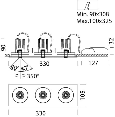 Microshop 3x - DIMM. Corpo: in alluminio pressofuso con dissipatore. Telaio: In alluminio con faretti orientabili e basculanti. Equipaggiamento: Completi di molle per controsoffitti di spessore da 1mm a 25 mm. Riflettore: In policarbonato metallizzato adalto rendimento. Normativa: Prodotti in conformità alle norme EN 60598-1-CEI 34.21, hanno grado di protezione secondo le norme EN 60529. 3LED COB 9W - 4000K - 900lm - CRI 92 - 38°. LED: Mantenimento del flusso luminoso al 70%: 50.000h (L70B50). Fattore di potenza: >0,9. Colore: bianco. Alimentatore elettronico dimmerabile 1-10V + Lampada.