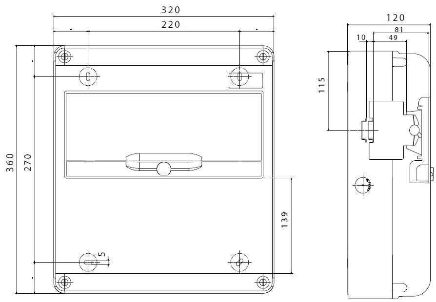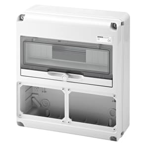 Quadro stagno Q-DIN 14 moduli vuoto in plastica grigio RAL 7035 IP65. • Numero di IEC 309/IB alloggiabili: 2 IB Orizzontali 16/32 A SBF IP44 affiancate • Numero di coperchi ciechi in dotazione: 1 IB 16/32 A