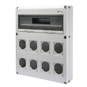 Quadro stagno Q-DIN 20 moduli vuoto in plastica grigio RAL 7035 IP65. • Numero di IEC 309/IB alloggiabili: 8 IEC 309 16/32 A IP 44/67 • Numero di coperchi ciechi in dotazione: 2 IEC 16/32A