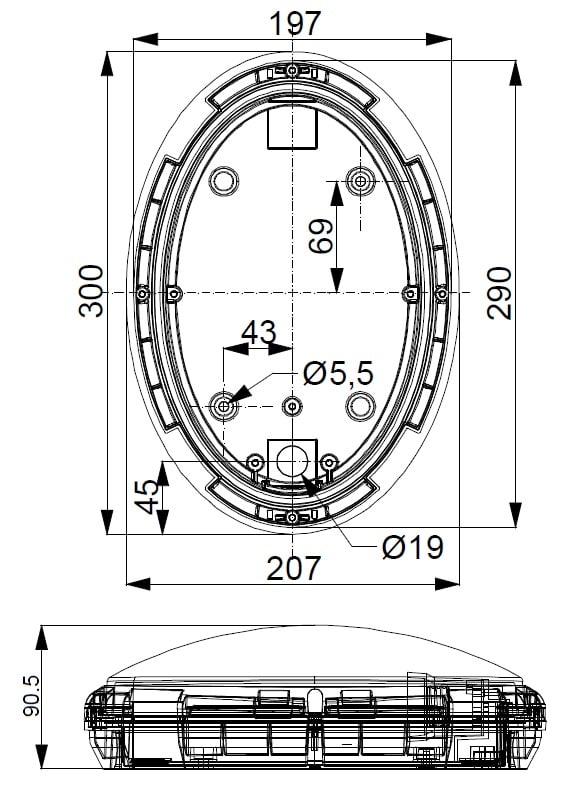 Struttura in policarbonato nero. Completo di base, cablaggio, vetro e cornice. Coppa in vetro satinato. Ingresso cavi dal retro o laterale mediante passacavo o giunto tubo/scatola. Alimentazione passante consentita. Viti inox. Lampade a basso consumo.