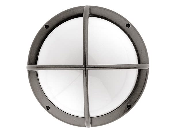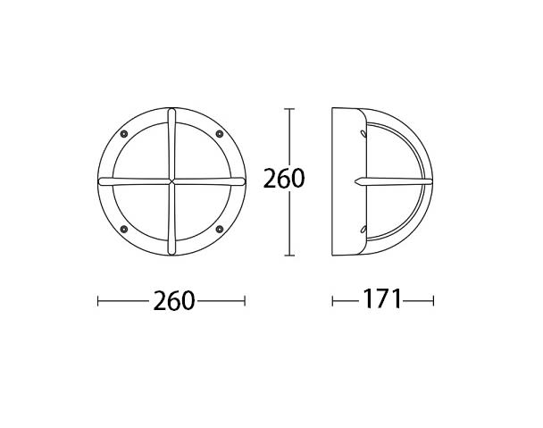 Kasko Tonda con griglia - Antivandalo. Griglia e base in alluminio pressofuso. Coppa in policarbonato opale stabilizzata UV. Viti inox testa a brugola. Riflettore precablato in alluminio 99,8 brillantato. Verniciatura a polvere poliestere dopo fosfocromatazione stabilizzata raggi UV. Ingresso dal retro o laterale. Lampada: E 27 Dulux El 1X100W/20W.