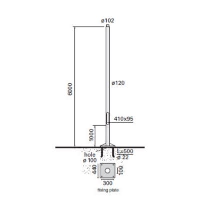 Palo cilindrico realizzato in acciaio zincato a caldo 70 micron, come da normativa UNI EN ISO 1461 (EN 40-5), con successivotrattamento superficiale di verniciatura acrilica a polvere texturizzata (grigio/nero). Il palo è costituito da un unico tubo saldato conall’estremità superiore un codolo cilindrico ø102mm L=106mm; è in acciaio EN10025S235JR (ex Fe360 UNI7070), ha diametro 120mm, spessore 3 mm e altezza 6000 mm. L'asola per la portella è dimensiona a 410x95 mm, ad altezza 1000 mm dal terreno,idonea per il montaggio della morsettiera ad un fusibile (cod. 1862) o a due fusibili (cod. 1865/1863). Il palo permette l'installazione dimorsettiere italiane/francesi/spagnole, inglesi (con adattatore in legno da ordinare separatamente) e tedesce/svizzere (con guida DINda ordinare separatamente). Portella realizzata a filo, in fusione di alluminio; ad essa è correlata la relativa chiave, triangolare grande(9 mm lato chiave) per portella (cod. 0246). La chiusura è assicurata tramite una guarnizione di tenuta antinvecchiante che si adattaalle irregolarità superficiali del palo. La portella è montata per mezzo di una contropiastra, fissata all'interno al palo tramite saldaturaa punti. Internamente al palo è saldato un gancio metallico, atto a supportare la morsettiera. Esso è costituito da un tondinometallico, di diametro 4 mm, ripiegato due volte, di dimensioni 40x26 mm. La piastra di ancoraggio per il supporto del palo è inacciaio EN 10025-S235JR (ex Fe 360 UNI 7070) zincato a caldo 70 micron, come da normativa UNI EN ISO 1461 (EN 40-5); hageometria quadrata, con 4 smussi 40x45°, dimensioni 400x400 mm e spessore 20 mm. Le 4 asole di dimensione 67x30 mm, coninterasse di 300x300 mm, permettono il passaggio dei tirafondi di fissaggio. Il palo è assicurato alla piastra tramite saldatura allabase, inoltre 4 alette di rinforzo sono saldate intorno ad esso.; I tirafondi in acciaio, lunghi 500 mm e con diametro 24 mm, sonobloccati tramite viterie in acciaio. Colore: Grigio.